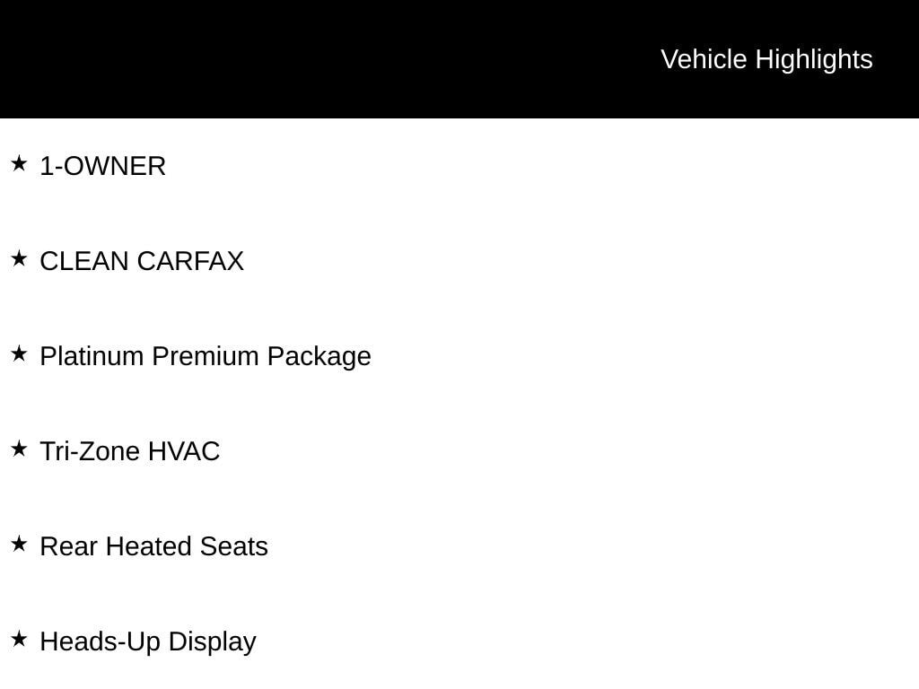 - PLATINUM PREMIUM PACKAGE (Includes Rear Heated Seats, Tri-Zone HVAC, Head Up Display)